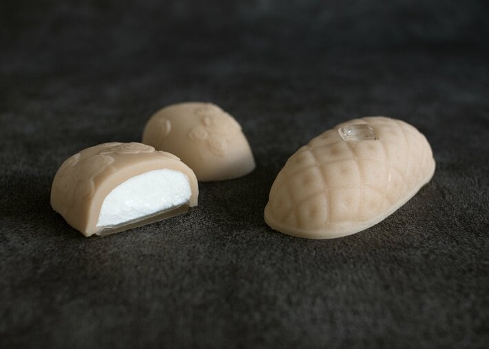 日本の伝統素材は、その繊細さと機能性の高さにおいて世界に類を見ません。新作『ベルベット・クリームケーキ』は、この練り切り、求肥、羊羹といった和菓子の素材を使いながら、和菓子の枠を破壊するという矛盾に挑みました。外装の練り切りが白象牙や白磁の質感を生み出し、中身は洋菓子の核となる高濃度生クリームで構成。和素材がクリームケーキの構造を担う、「和菓子ではない、全く新しい何か」の誕生です。