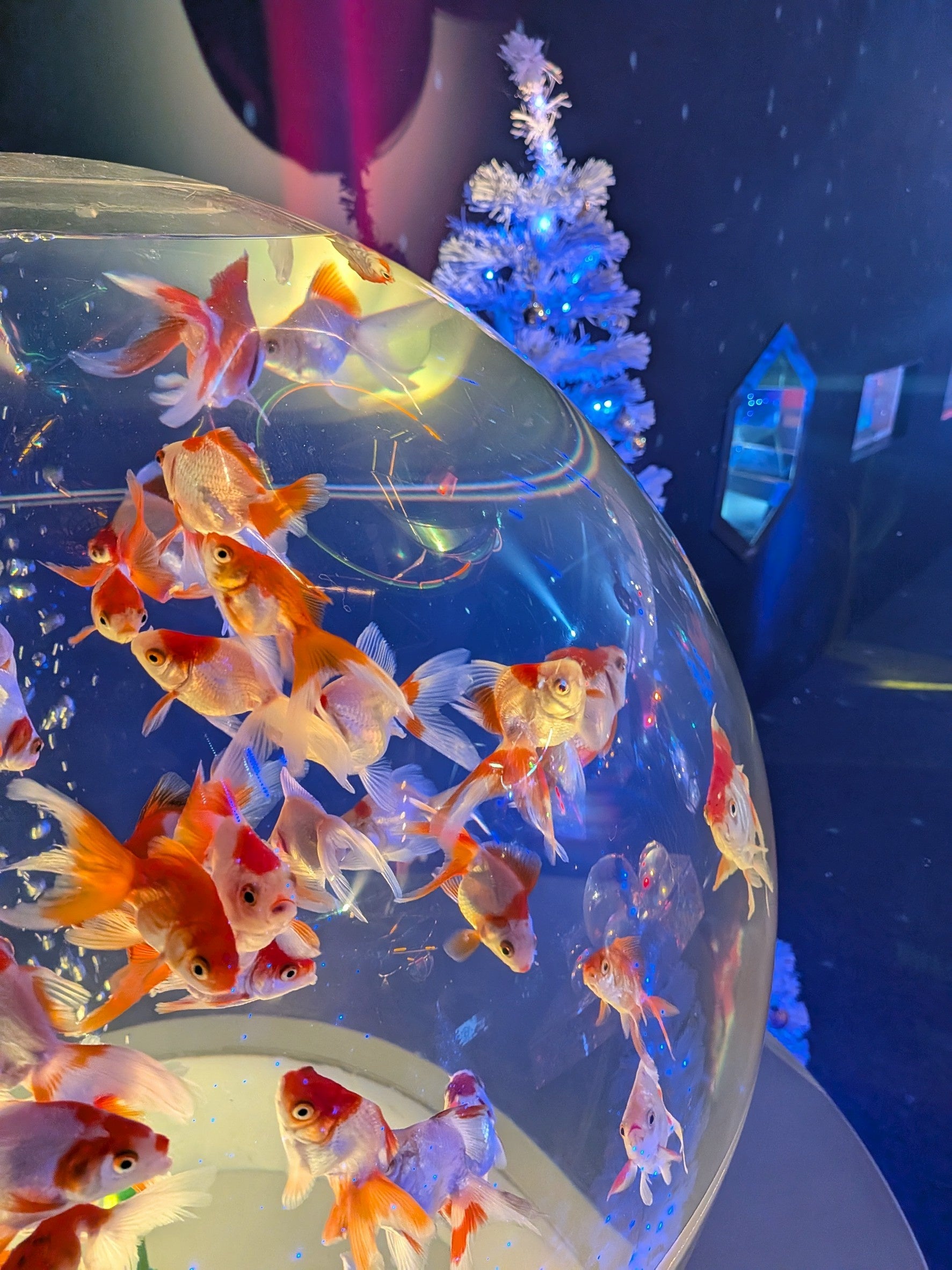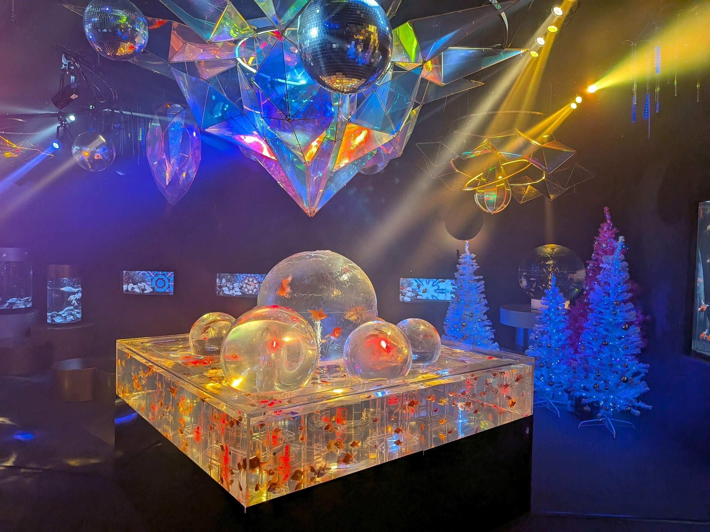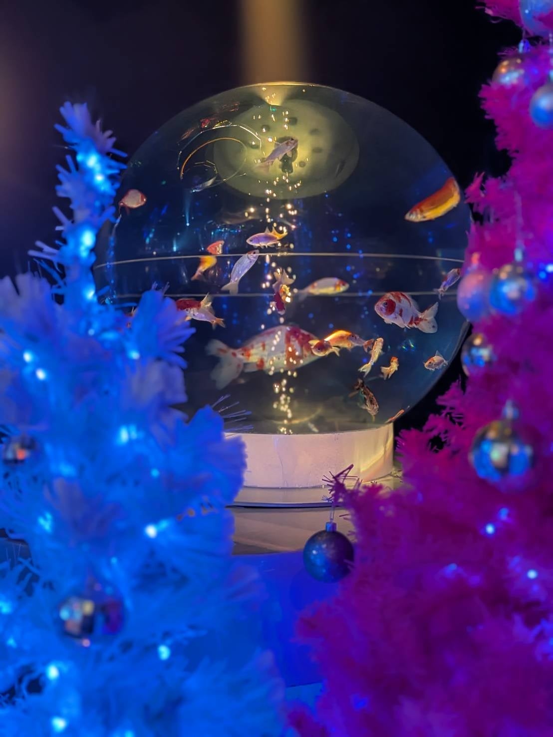 館内全体では、白いツリーや冬をイメージした装飾を加え、通常展示をやわらかな冬景色へとアレンジしています。なかでも冬企画の中心となる「ZONE7:金魚ディスコ -KINGYO DISCO-」では、白系の金魚を多く取り入れた水槽展示と、エリア全体に雪が降る演出を組み合わせることで、水中と空間の両方で冬の情景を表現しました。幻想的な雰囲気をお楽しみいただける、期間限定のデザインとなっています。