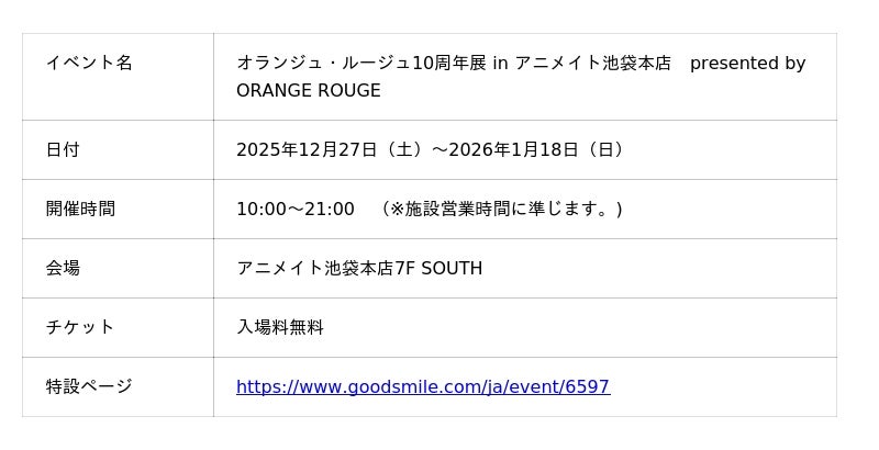 株式会社グッドスマイルカンパニー(本社:東京都千代田区、代表取締役社長:岩佐厳太郎、以下 グッドスマイルカンパニー)と株式会社マックスファクトリー(本社:東京都千代田区、代表取締役社長:渡邊誠、以下 マックスファクトリー)が展開する男性キャラクターに特化したフィギュア・グッズのブランド「オランジュ・ルージュ」の10周年を記念した展示・物販イベント「オランジュ・ルージュ10周年展 in アニメイト池袋本店 presented by ORANGE ROUGE」を、2025年12月27日(土)から2026年1月18日(日)にアニメイト池袋本店7F SOUTHにて開催致します。