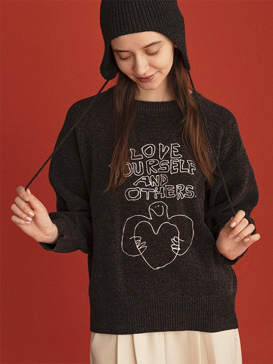 『LOVE』をテーマにオリジナルで描き下ろしていただいたイラストを刺繍したモールヤーンニット。