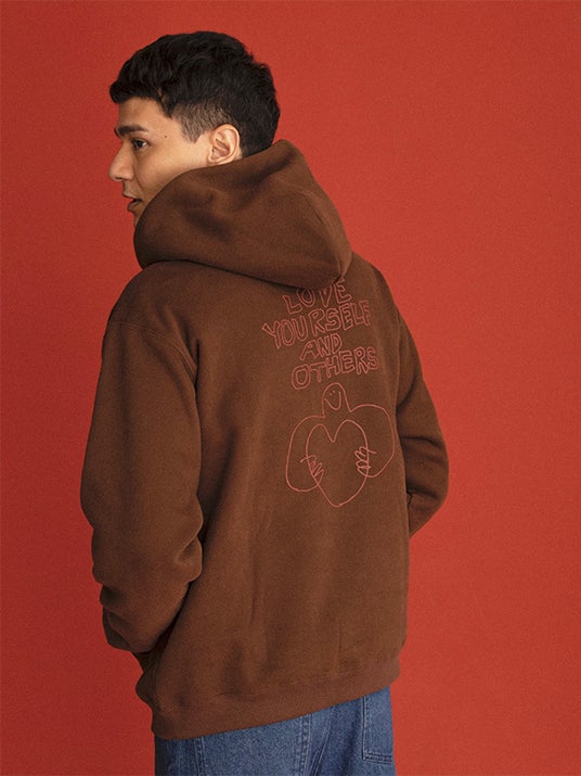 『LOVE』をテーマにオリジナルで描き下ろしていただいたイラストをバックに刺繍したスウェットフーディー。胸元にもメッセージロゴの刺繍をワンポイントに施しました。