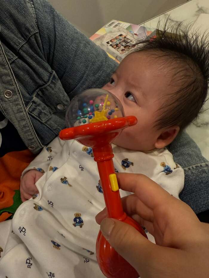 そして、上からぶら下げられた、ポケモンのメリーに夢中な弟くん。