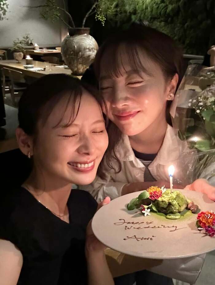 別のショットでは、能條さんがお祝いプレートを持ち、目を瞑り幸せそうな表情を浮かべる2人。サプライズのためか、薄暗くなった店内でロウソクの灯りに照らされながら仲睦まじい2ショットを披露しています。