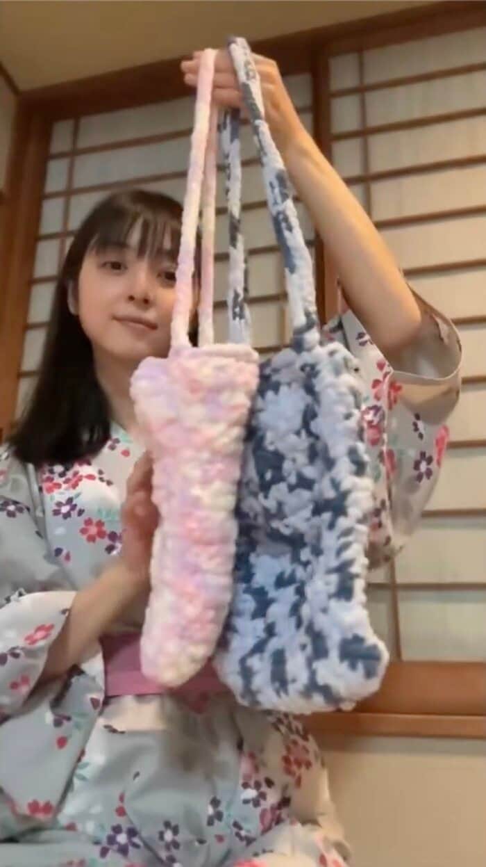 その後の旅館では、「温泉に入ったり、少し編み物が出来て、リフレッシュ皆んなで浴衣も着た」と、旅先でも、ハマっているという編み物をしたといい、浴衣姿で完成したピンクのバッグと青色のバッグを披露する姿を見せました。