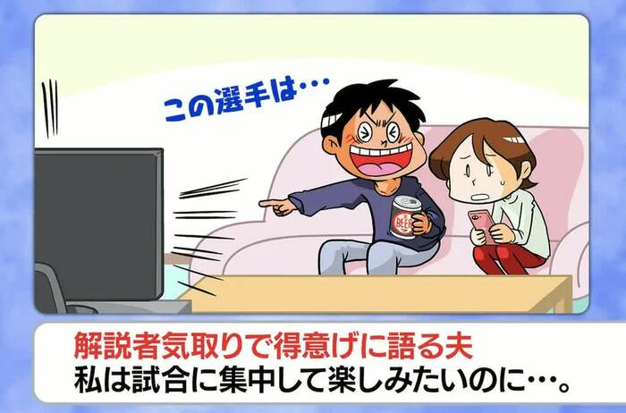 まず登場したのは、「ドイツ戦の観戦中、夫が解説者気取りで話し始めた。私は試合に集中したいのに…」という妻の怒りの声です。