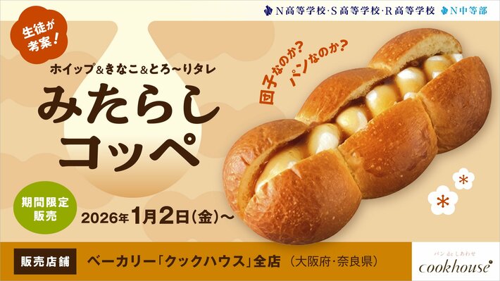 学校法人角川ドワンゴ学園N高等学校・S高等学校・R高等学校(以下、N高グループ)、N中等部の生徒が考案した新商品「みたらしコッペ」が、2026年1月2日(金) より、大阪府内を中心に展開するベーカリーショップ「クックハウス」全店で販売されます。