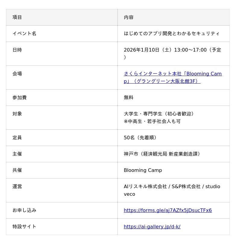 AIリスキル株式会社(本社:大阪市北区、代表取締役:山原慎也)は、神戸市が推進する学生向けデジタル人材育成プロジェクト「こうべデジタル活動部(デジ活)」の一環として、Blooming Camp(さくらインターネット株式会社)との共催イベント「はじめてのアプリ開発とわかるセキュリティ」を2026年1月10日(土)に開催いたします。