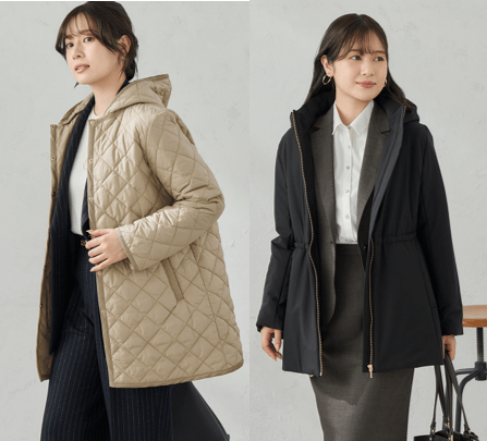 ノンキルト・ゆるトレンチコート・キルトコートミドル丈・キルトコートショート丈・キルトベストの5タイプ展開で、さまざまなシーンでお使いいただけます。キルトコートショート丈とキルトベストはインナーとしても活躍します。