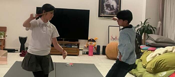 「稽古してました。」と、なんと自宅のリビングで子供たちが向き合い、真剣な表情で稽古に励んでいる姿が。それぞれ片手に棒を持ち、腰を低い位置にキープしているようにも見え、熱心な様子が伝わってきます。