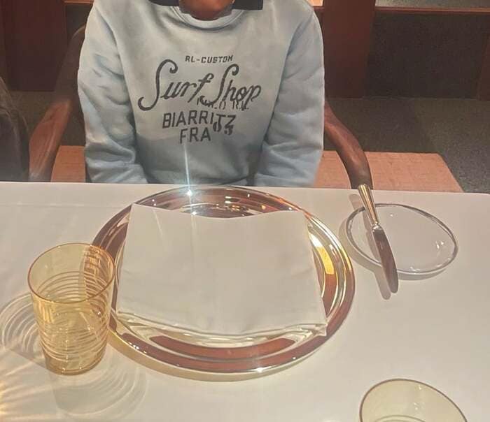 白のテーブルクロスが敷かれた上には、キランと光る大きなお皿が置かれ、そばにはナイフが置かれています。