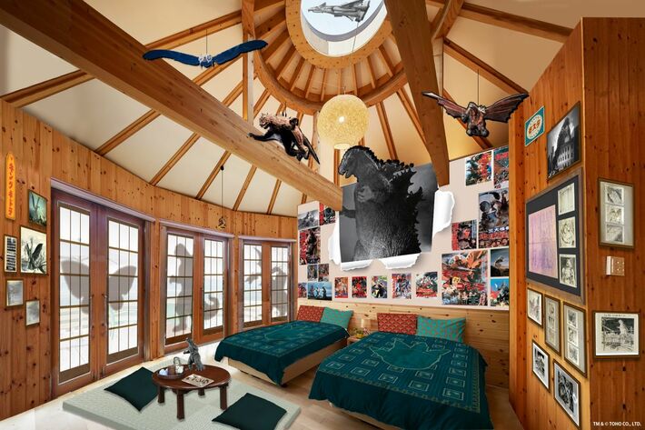 「GRAND CHARIOT 北斗七星135°」の一棟を、日本を代表する特撮映画「ゴジラ」をテーマに装飾。“昭和レトロ”をモチーフに、同作品の世界観と昭和時代が再現された空間を存分に楽しむことができる。