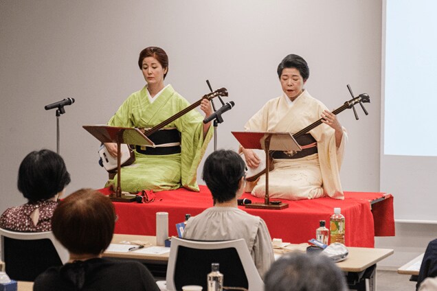 〈明暮れ小唄〉 のお二人から小唄を演奏する際の三味線について「三味線は一般的には撥(ばち)を用い演奏しますが、小唄は弦を指で弾く爪弾き(つまびき)で演奏されます」と紹介がありました。参加者からも「柔らかい音色が日本酒やおつまみ(の味わい)と共鳴するようにも感じます。」というコメントもありました。音と味覚には密接な関係があり、「ソニック・シーズニング(音の調味料)」というように食事中に聞こえる音楽などの音によって味覚が変化するという現象も論文として報告されています。日本酒や酒肴が持つ共通の柔らかさや深みのある味わいと爪弾きで弾く三味線の音色が、お互いに引き立て合う役割を担っていることを昔の人々も感覚的に理解していたのかもしれません。