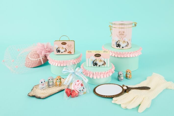 今年、カファレルは創業200周年を迎えます。この特別な年を記念し、アニバーサリーロゴをあしらった華やかなコレクションが登場。街角のティーサロンで、カファレルのスイーツを囲みながら語らう猫たち。そんな優雅で幸せなひとときをチョコレートに閉じ込めた、贈るのが楽しくなる、贈られて嬉しいねこの日のギフトシリーズです。昨年のジャンドゥーヤ生誕160周年に続き、この特別なタイミングしか手に入らない限定缶をぜひお楽しみください。
