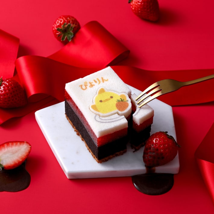 トップにはかわいい「ぴよりん」をプリント。ガトーショコラ・真っ赤なストロベリーゼリーの色の対比がぴよりんのかわいさを引き立てる、華やかな印象に仕上げました。深いカカオのコクにいちごの爽やかな酸味が重なり、奥行きを感じる豊かな味わいに。しっとりとしたガトーショコラとぷるんと弾むゼリーの食感が、口の中で表情を変える楽しさも魅力です。
