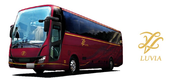 LUVIA名称由来は“Luxury + Via”(贅沢な旅路)です。車両外観のデザインは高級感のあるワインレッドをベースに、海や山をイメージしたデザインを施しております。