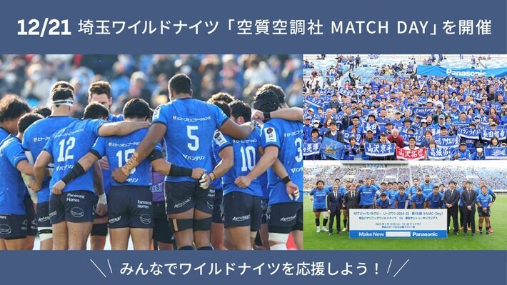 パナソニック株式会社 空質空調社は、2025年12月21日(日)、オフィシャルパートナーを務める埼玉パナソニックワイルドナイツのNTT JAPAN RUGBY LEAGUE ONE 2025-26 ホストゲーム開幕戦 浦安D-Rocks戦に、マッチデーパートナーとして協賛します。当日は「空質空調社 MATCH DAY」と称し、パナソニック 空質空調社の公式Xフォロワーの方を対象とした「ガラポン抽選会」や、子ども向けの「風車づくりワークショップ」など多数のイベントを予定しています。