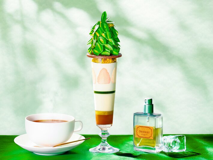 最下層には、シャルトリューズの風味をまとった濃厚なガナッシュをたっぷりと。上層部は甘さを控えめにまとめ、最後にチーズとチョコレートの相性抜群な組み合わせでしっかりとした甘さを感じていただける構成としました。一口ごとに表情が変化する、新鮮なパフェ体験をお楽しみいただけます。
