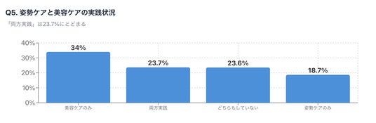 姿勢ケア(ストレッチ・整体・ヨガなど)と美容ケア(スキンケア・美容医療など)の実践状況を調査しました。その結果、「両方実践している」方は23.7%、「美容ケアのみ」が34.0%、「姿勢ケアのみ」が18.7%、「どちらもしていない」が23.6%という結果になりました。