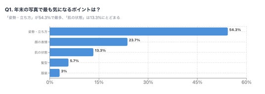 年末の集合写真やイベント写真で、自分自身について最も気になるポイントを調査したところ、「姿勢・立ち方」が54.3%で最多となりました。次いで「顔の表情」が23.7%、「肌の状態(シミ・くすみなど)」は13.3%にとどまりました。