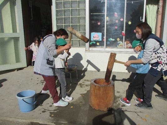 ・小さな職人たち: 職員の手本を見た後、5歳児が「よいしょ!」の掛け声に合わせて力強く杵を振るいます(状況により4歳児も参加) 。