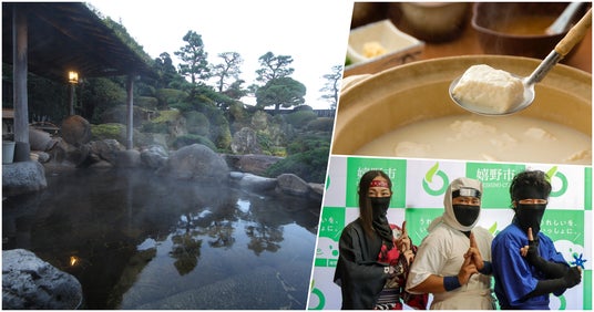 旅の疲れを癒すのは1300年の歴史ある「日本三大美肌の湯」。右上は嬉野名物「嬉野温泉湯どうふ」。右下は佐賀忍者3人衆。