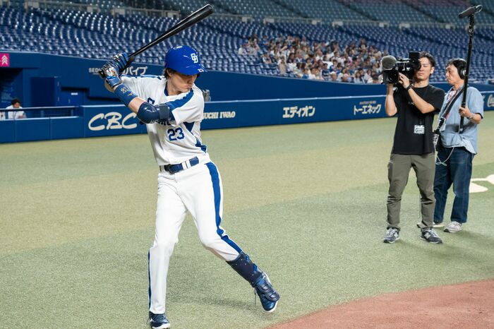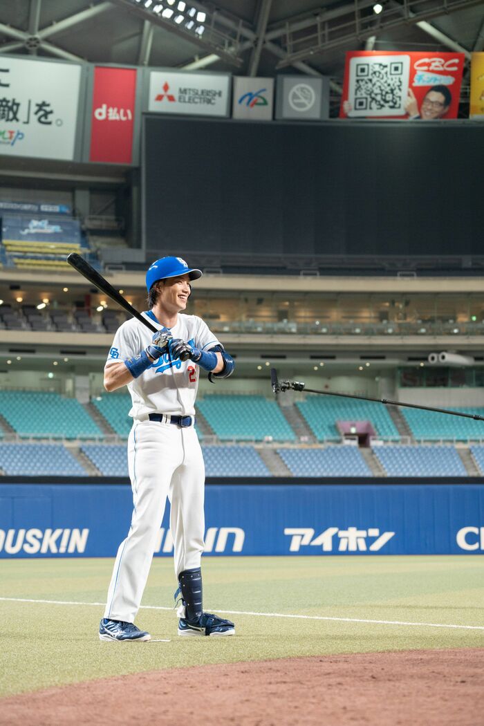 この日は、グラウンドに足を踏み入れる前に、軽く一礼をして撮影に臨みました。ドラマでは、試合のシーンだけでなく、バッティング練習など野球にかかわるシーンが多いこともあり、日ごろから素振りなどのトレーニングを欠かさず行ってきたといいます。