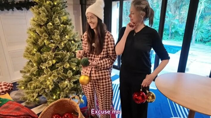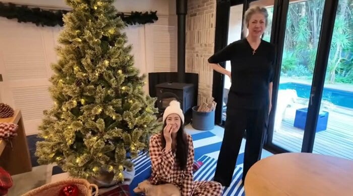 ウッド調の家具やまきストーブなど、おしゃれな雰囲気の自宅リビングには、高さが240cmもあるというツリーが!このツリーを飾り付けしていくようで、お手伝いで森さんの母が参加します。