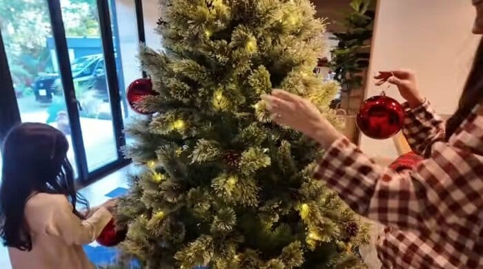 ツリーにオーナメントをつけていく様子では、7歳の娘も一緒に飾り付けに参加!