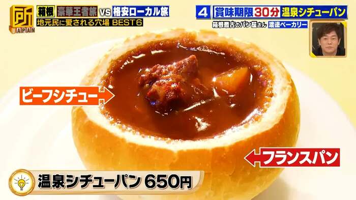宮ノ下駅付近にある、箱根最古のパン店「渡邊ベーカリー」では、フランスパンの器にビーフシチューが入った「温泉シチューパン」(650円)を販売。