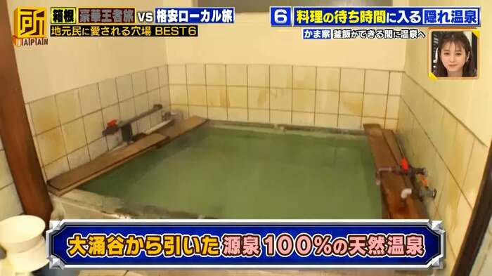 「休憩処 かま家」では、店主の大倉スズさんが一つひとつ手作りする釜めしが販売され、提供までの待ち時間に、大涌谷から引いた源泉100%の天然温泉に入ることができます。