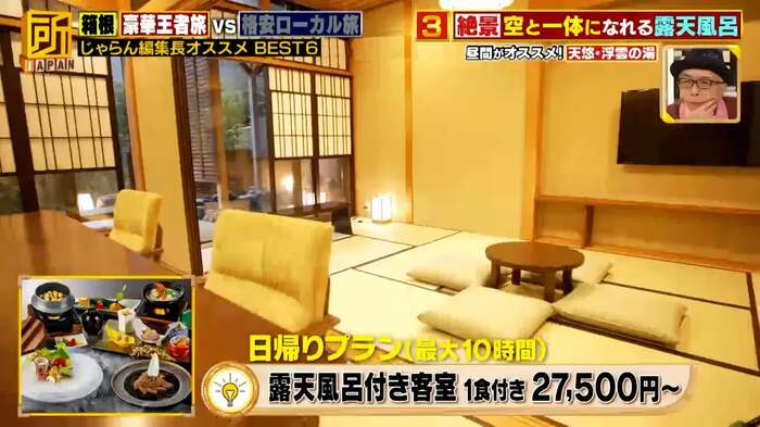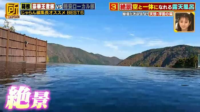 そんな、箱根を紹介するにあたり、番組では、じゃらん編集長に聞いて組んだ、王道おすすめツアー「豪華王者旅」と、予算6000円でも満喫できる、穴場スポットを巡る「格安ローカル旅」を行い、その魅力を比較しました。