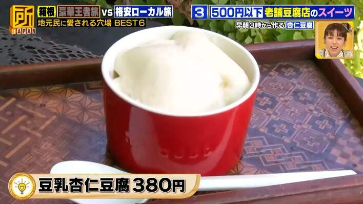 江戸時代から続く「萩野豆腐店」では、豆乳で作った「豆乳杏仁豆腐」(380円)を販売。