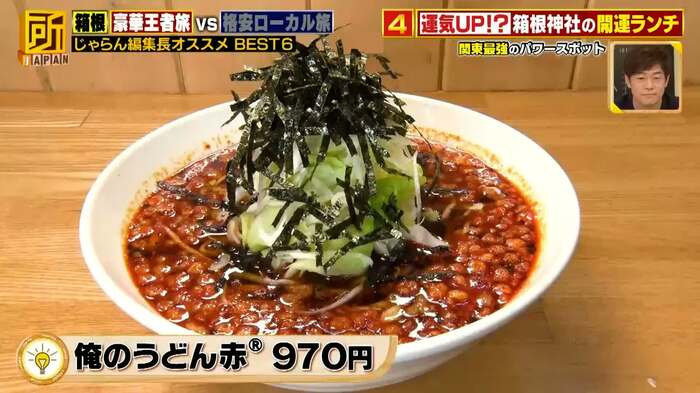 「箱根神社」の境内にある、「箱根神社 お休み処 権現からめもち」では、「俺のうどん赤®」(970円)を販売。