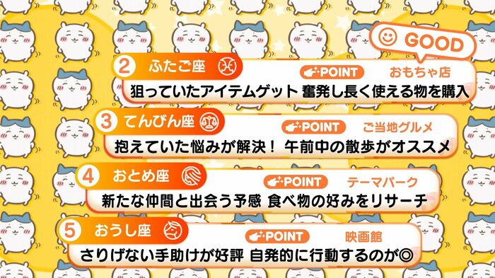 『めざましテレビ』で放送中の「ちいかわ占い」 テレビ放送がない日はお休みで、月~土:朝7時以降に更新予定です。