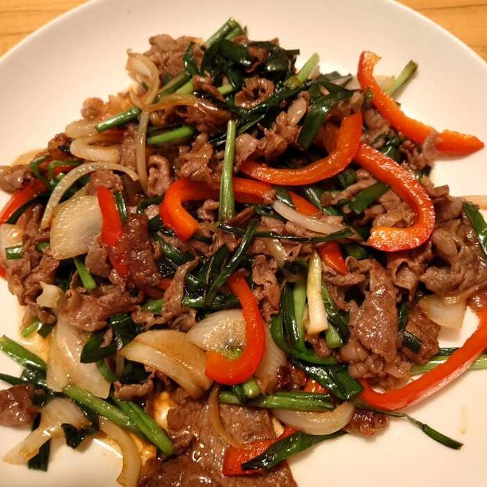 「牛バラのニラと玉ねぎと赤パプリカの炒め物」では、お皿にたっぷりと盛り付けています。
