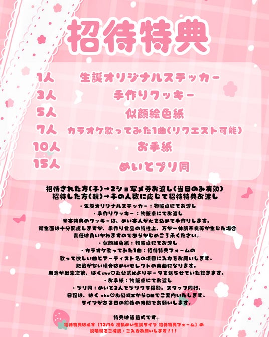 招待人数に応じてステッカー、手作りクッキー、似顔絵色紙などをプレゼント。生誕イベントを「新規ファンが増える仕組み」として活用する取り組み。