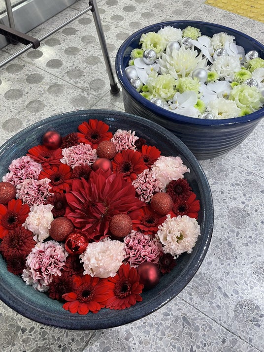 ※花手水:参拝前に手や口を清めるために設けられた寺社の手水舎(ちょうずしゃ)や、公共施設などに置いた睡蓮鉢に色とりどりの花を浮かべたもの。