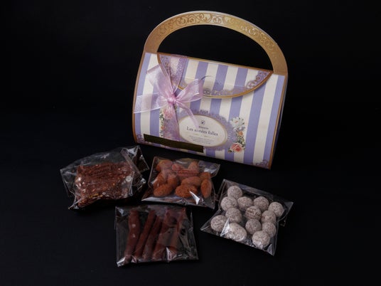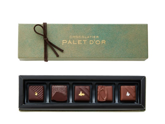 「温故知新」「レトロモダン」をテーマに、伝統菓子を現代風に再構築したフランス菓子や、パリスタイルの華やかなデコレーションなど、独創性を表現している、東京・恵比寿のパティスリー<レザネフォール>。一粒ひと粒丁寧に作られた味わいや食感が楽しめるショコラ4種(ショコラコンカッセ、アマンドショコラ、ノワゼットショコラ、オランジェット)が詰められた一箱です。