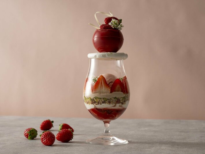 グラスの中央には、フレッシュな甘酸っぱさを楽しめるいちごのアイスクリームに、いちごと相性の良いまろやかなミルクチョコレートガナッシュ、ドライストロベリーやピスタチオ、アーモンドなどを重ね、食感のハーモニーをお楽しみいただけます。また、グラスの下層にはフレッシュないちごやさまざまなベリーがライチ酒のジュレとともに満たされており、マスカルポーネチーズとレモンのなめらかなシャンティや間にあるパリッとした板チョコレートとともに味わうと、いちごの爽やかさにまろやかさが加わり、上品な余韻が重なります。