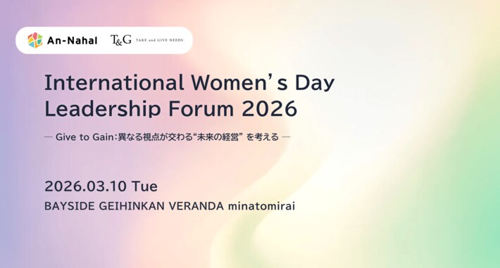 株式会社An-Nahal(所在地:神奈川県横浜市、代表取締役:品川優、以下An-Nahal)は、3月8日の「国際女性デー」に合わせ、株式会社テイクアンドギヴ・ニーズ(本社:東京都品川区、代表取締役社長:岩瀬賢治、以下T&G)と共催で、2026年3月10日(火)、BAYSIDE GEIHINKAN VERANDA minatomirai(神奈川県横浜市中区、運営:T&G)にて、「International Women’s Day Leadership Forum 2026ーGive to Gain:異なる視点が交わる“未来の経営”を考えるー」 を開催いたします。