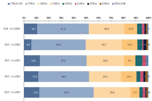 全体を通して17時台、18時台に就業している人は約8割で、19時台まで就業している人は約9割を占めています。この傾向は年代にかかわらず共通しており、終業後に一定の自由時間を確保している人が多い実態が明らかになりました。