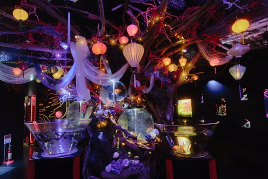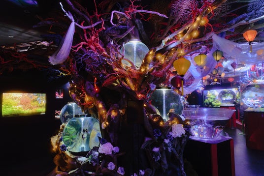 流木アートとオーロラのような光が銀河を思わせる空間をつくり、来場者はその中を歩いているかのような没入感を体験できます。白と青の光が重なり合う水槽では、白い金魚たちが光の筋を横切るように泳ぎ、漂う星々を間近で覗き込んでいるような感覚を味わっていただけます。
