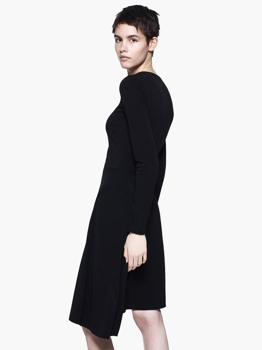 クリーンなラインに、片側へと流れるドレープが描くアシンメトリーの美しさ。
