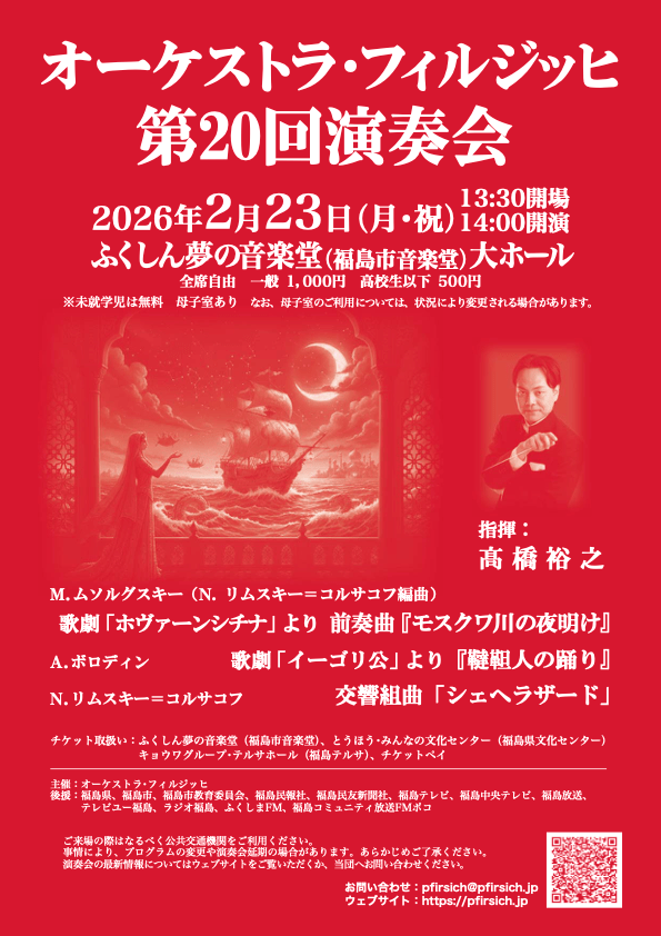 オーケストラ・フィルジッヒ『第20回演奏会』全曲ロシアの作曲家の作品を取り上げました。ムソルグスキー・ボロディン・コルサコフの懐が深く、陰影に富んだ個性豊かな世界をお楽しみください。