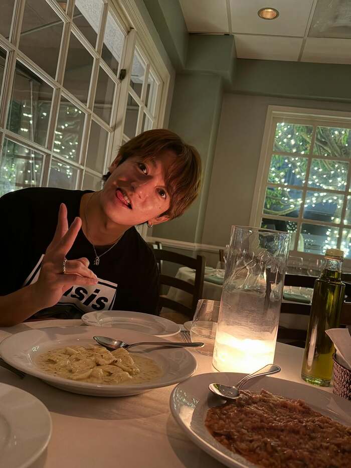 おしゃれなレストランでディナーも堪能したようで、リゾットなどの料理が並んだテーブルでのショットも公開。