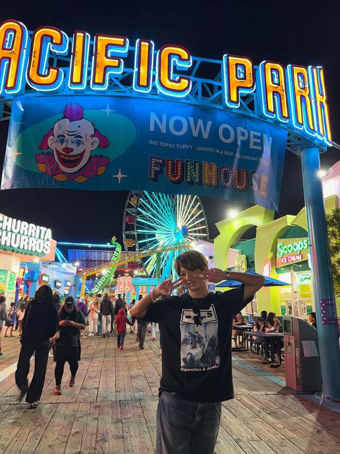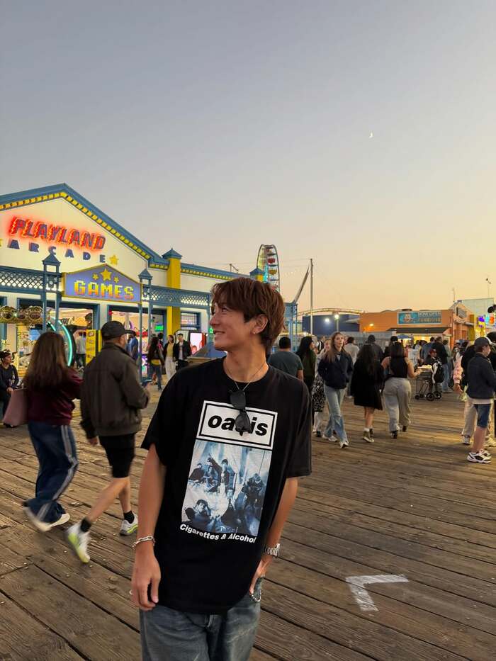 別の写真では、「PACIFIC PARK」と書かれた夜の遊園地のゲート前で、頬に両手でピースを添えたおちゃめなポーズを披露していて、大倉さんの楽しそうな様子が伝わってきます。
