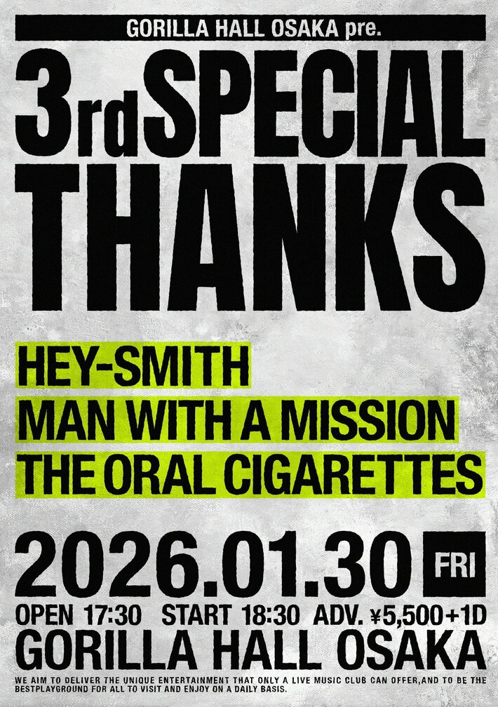 本イベントは、いわゆる“周年を祝っていただく”ためのものではなく、GORILLA HALL OSAKAがこの3年間で支えてくださったお客様へ感謝をお返しするための企画です。出演者として HEY-SMITH、MAN WITH A MISSION、THE ORAL CIGARETTES の3組を迎え、一夜限りの特別なライブをお届けいたします。