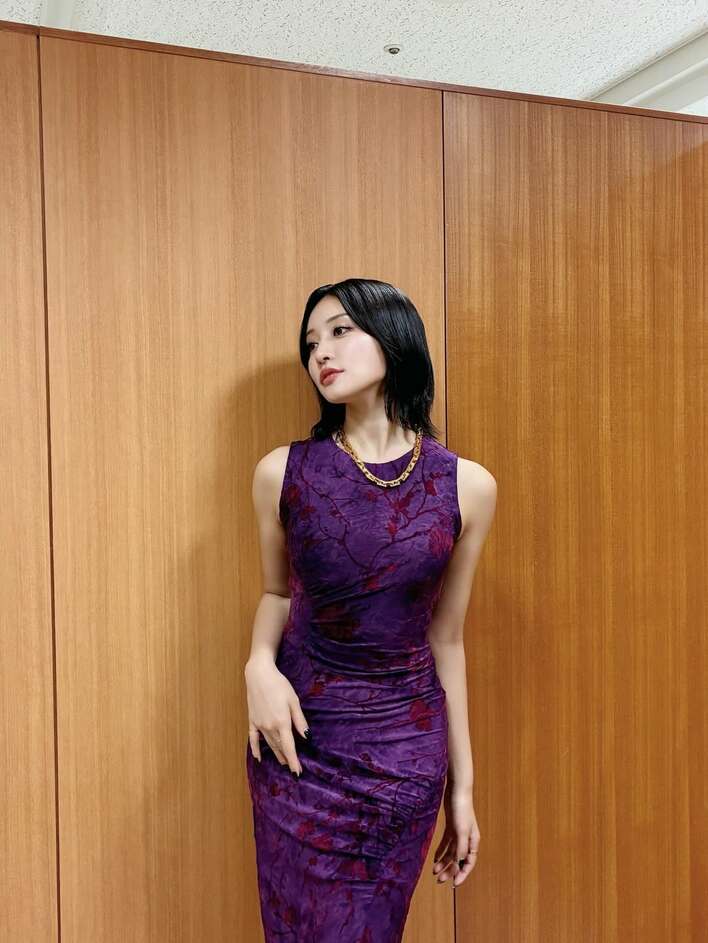 写真には、ボディコンのような体のラインが際立つ紫色のノースリーブワンピースを身にまとった王林さんの姿が。黒くした髪をセンターで分け、エレガントさが増した王林さんはアゴを少し上げ、首筋をアピールするように綺麗な横顔を見せています。