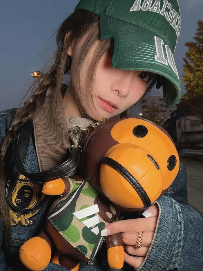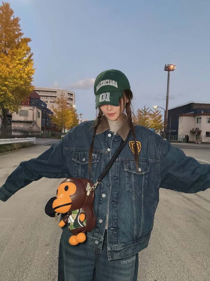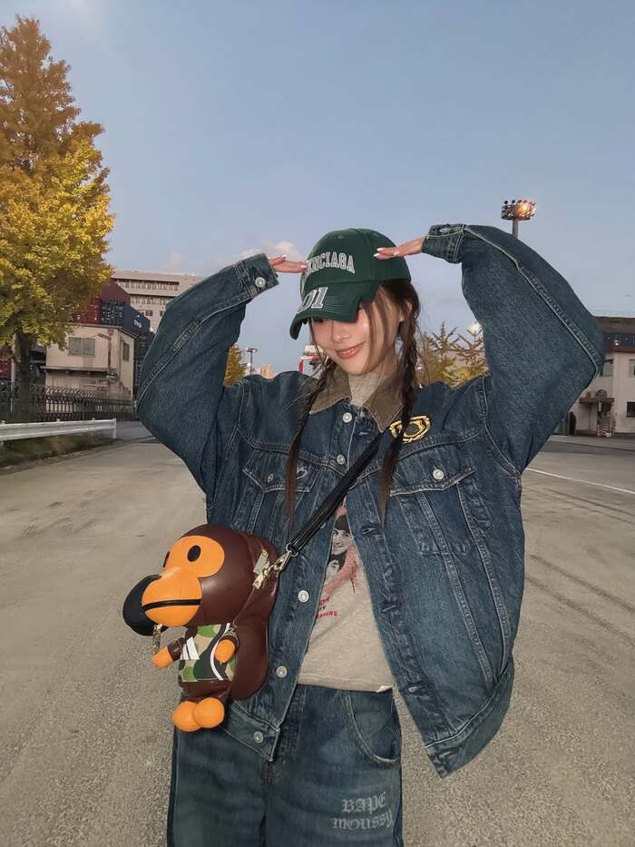 今回の投稿で重盛さんは、デニムのセットアップコーデを披露!肩にはぬいぐるみ型のショルダーバッグをかけていて、センス抜群です。