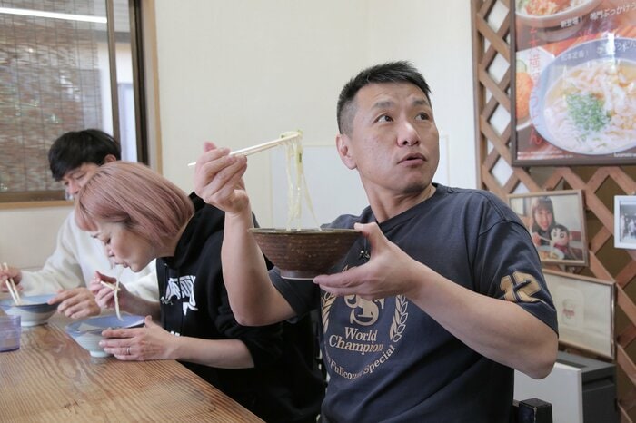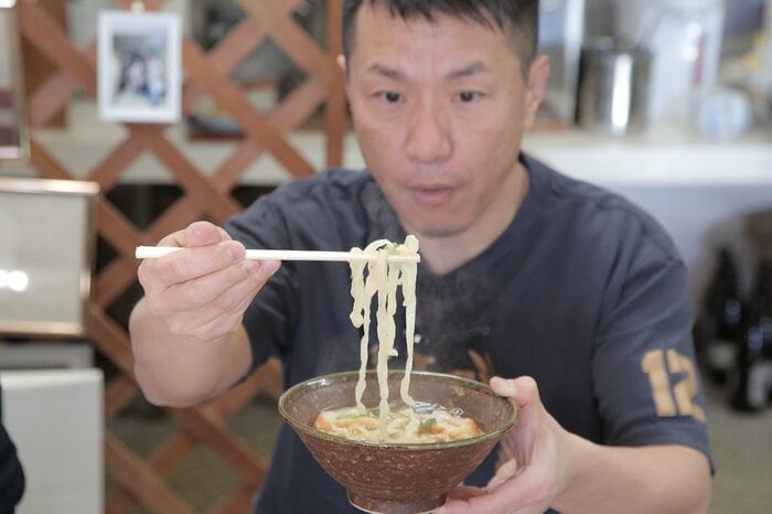 最初に訪れるのは、鳴門市民のソウルフード「鳴(なる)ちゅるうどん」が食べられる「舩本(ふなもと)うどん」。一本一本不ぞろいの柔らかい麺が特徴で、その食べやすさに感動します。